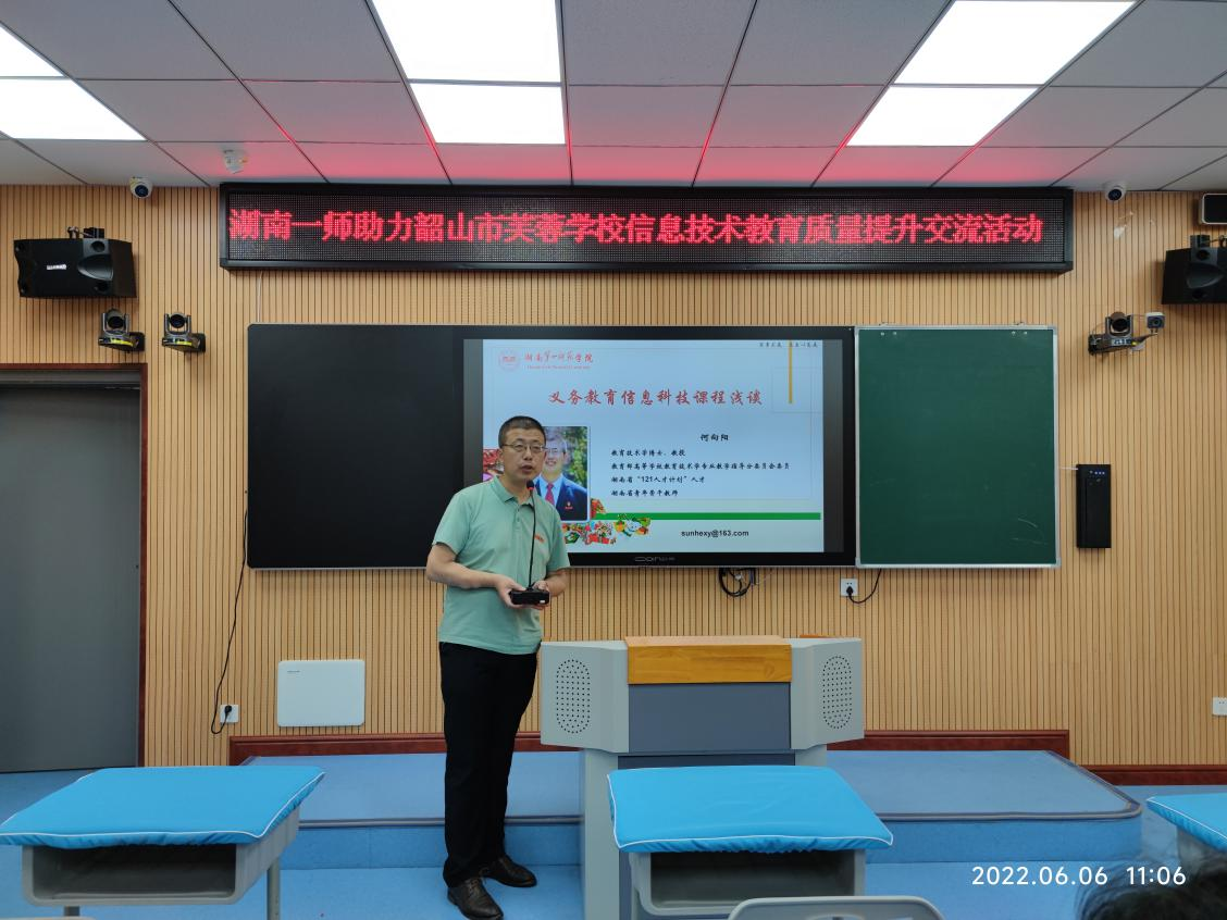 为提升芙蓉学校教育教学质量,实现城乡教育均衡发展,充分发挥威尼斯金沙在基础教育领域的引领示范作用,实现优质资源共享,2022年6月6日,威尼斯金沙欢乐娱人城副院长何向阳带领由教育技术学专业教学论团队成员、长沙市天心区青园小学教师龚宣运、湖南一师第一附属小学教师曹向荣组成的教育技术学帮扶团队,前往韶山市芙蓉学校开展信息技术教育质量提升交流研讨活动。此次活动由韶山市芙蓉学校校长李冬文主持,芙蓉学校全体行政、综艺组全体教师,韶山市各小学信息技术教师代表等参加了此次活动。